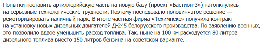 (22/25) Ukrainian Uragans have been reengined with Belarusian D-245 diesel engines, which have half the fuel consumption of the ZIL-375Ya. There have also been projects to replace the ZIL with modern chassis, like Bureviy or Bastion-3, but these are only in tiny numbers.