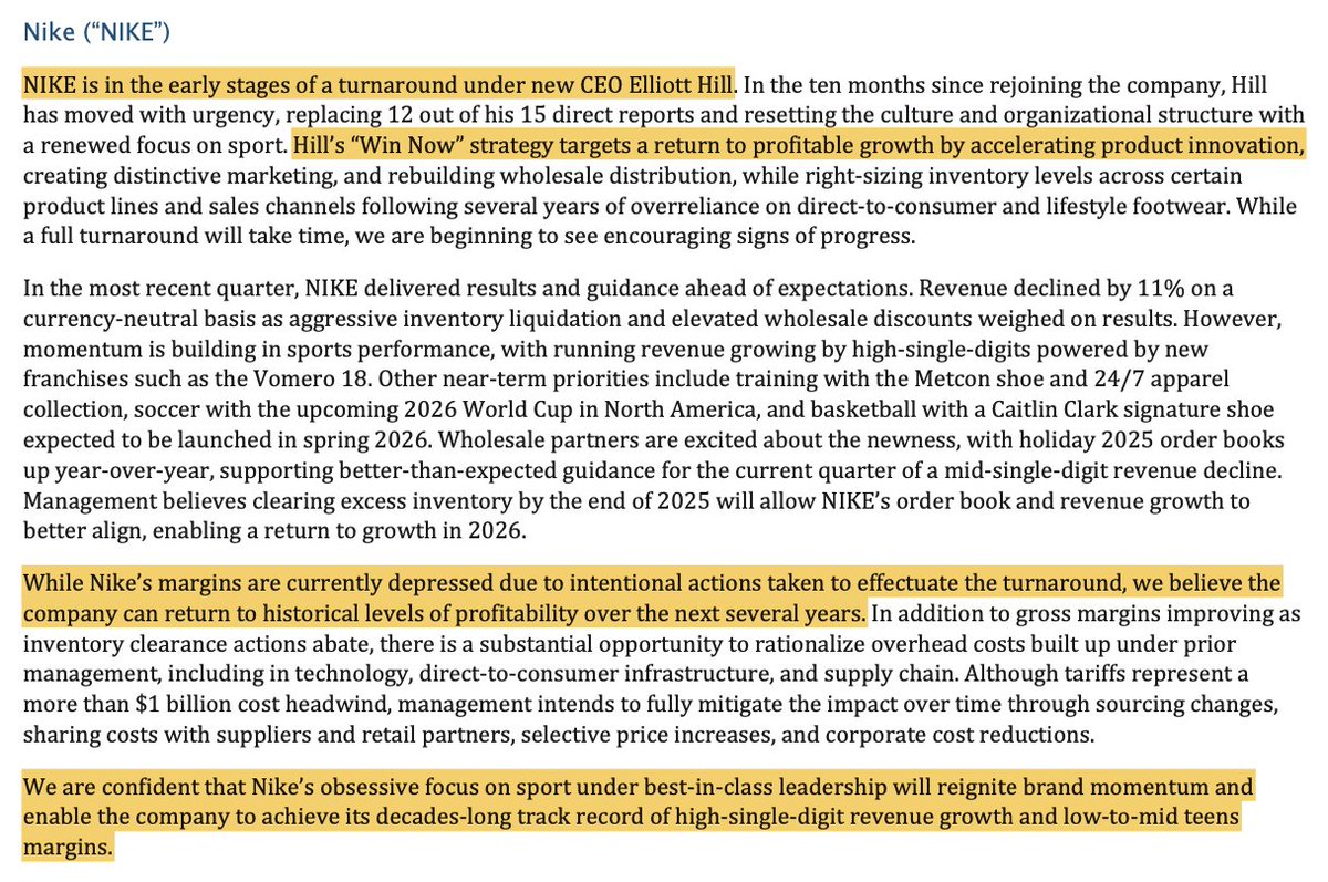 Bill Ackman's Pershing Square released an investor update that covered commentary on Pershing's holdings, which include $GOOGL Alphabet, $AMZN Amazon, $CMG Chipotle, $NKE Nike, $UBER Uber, and more.