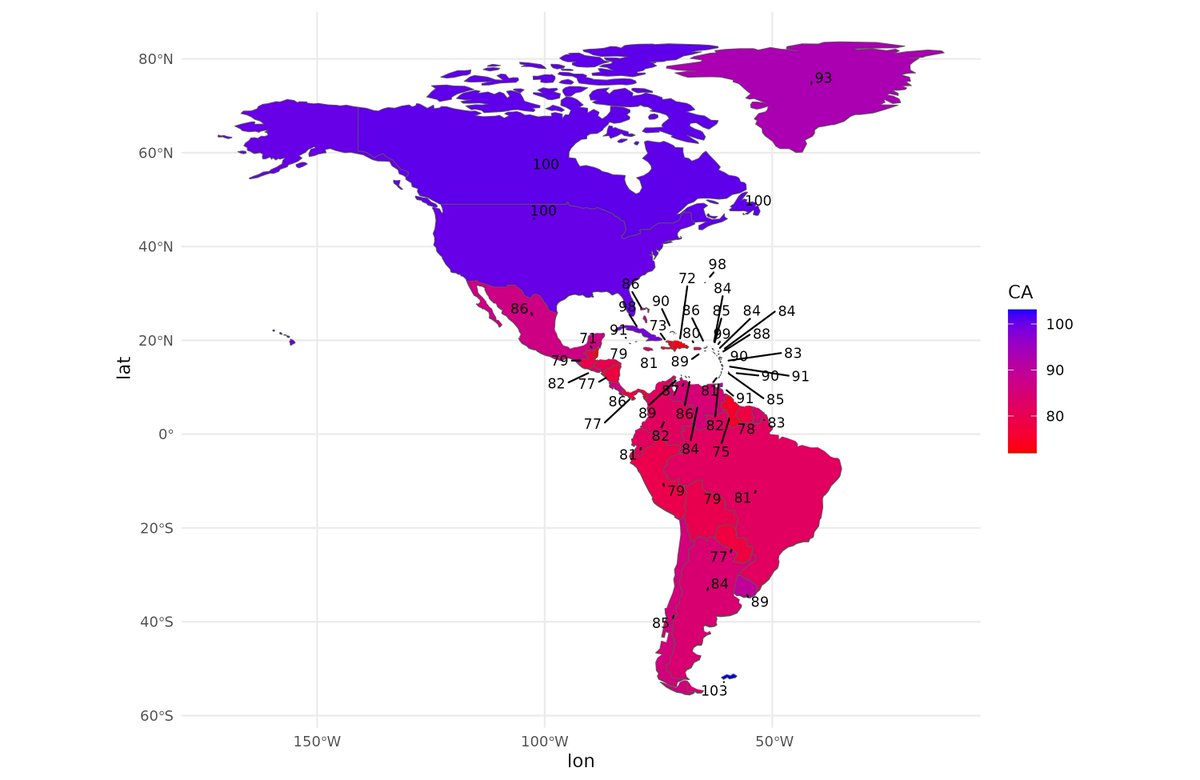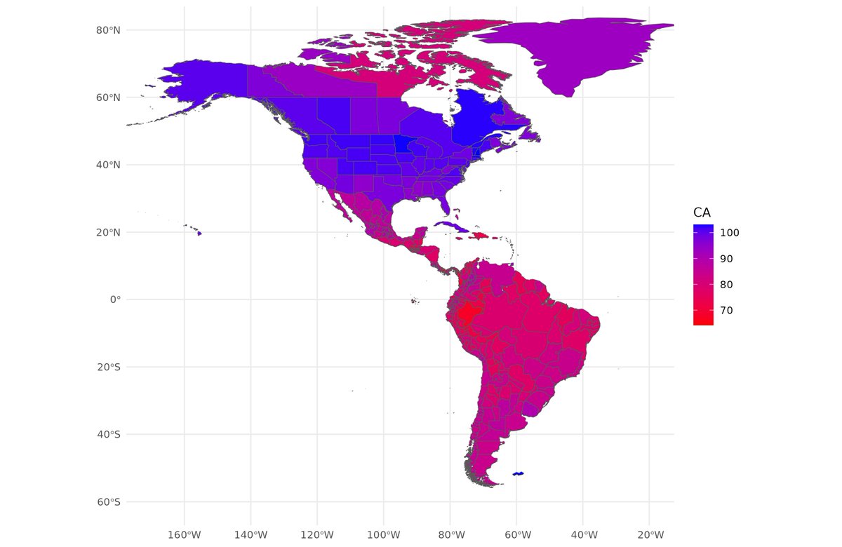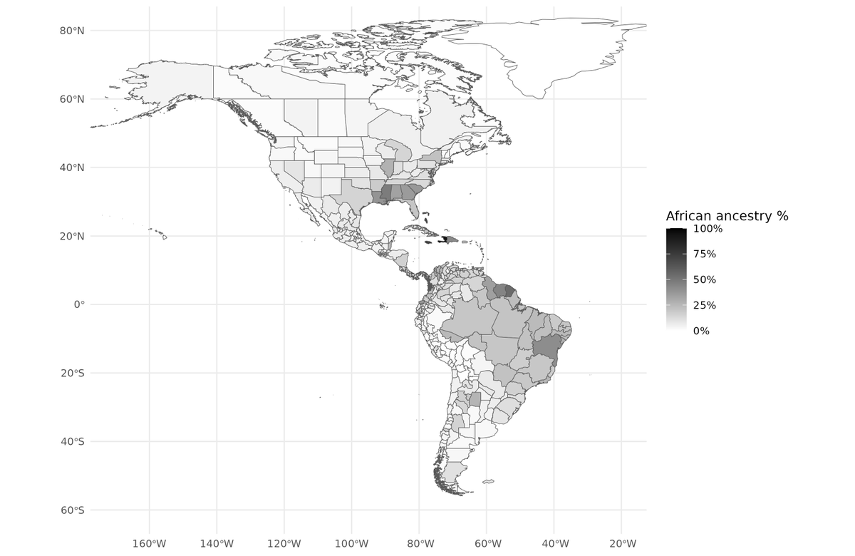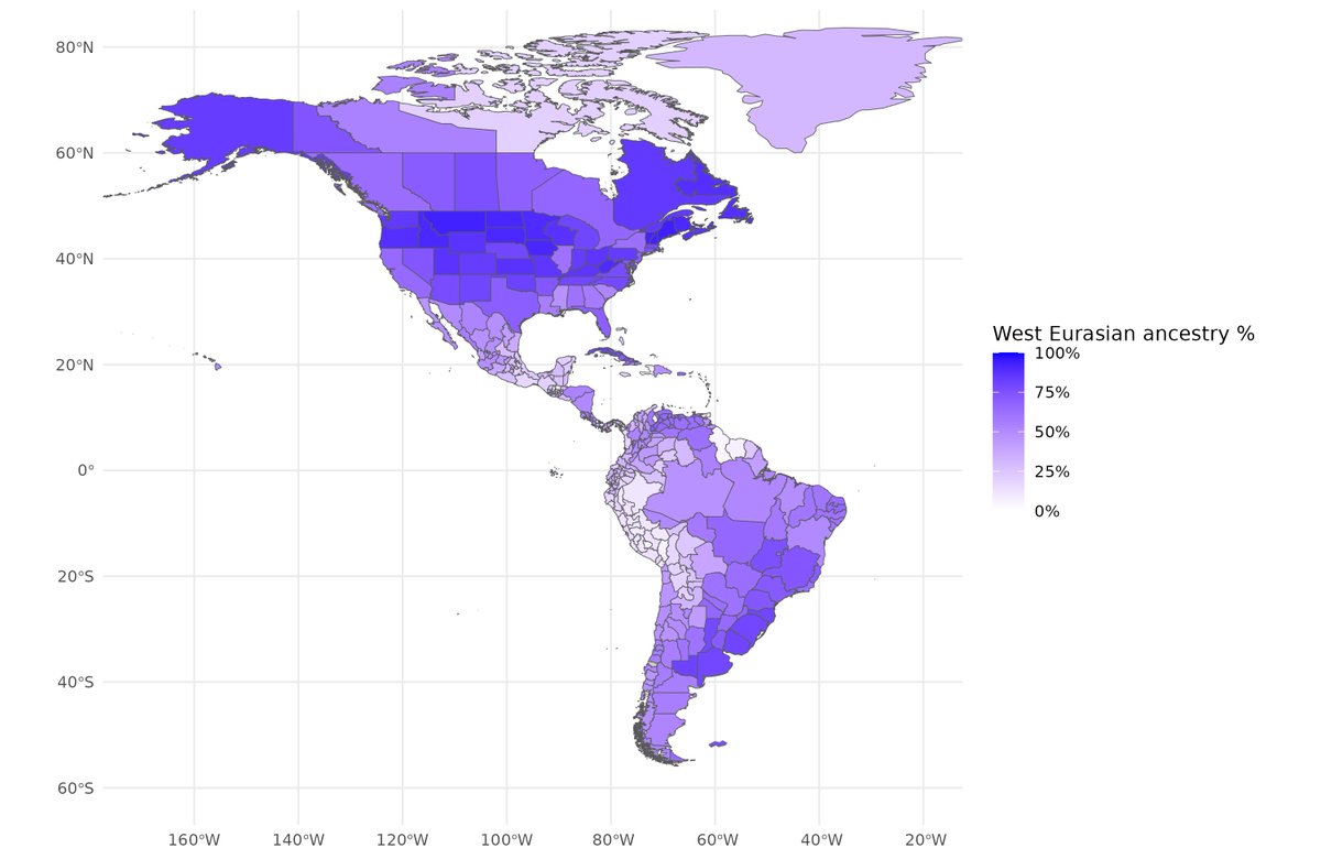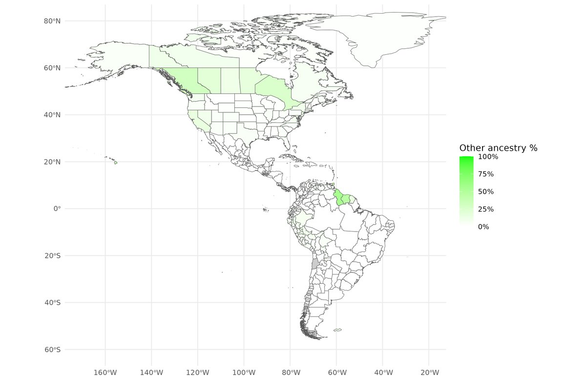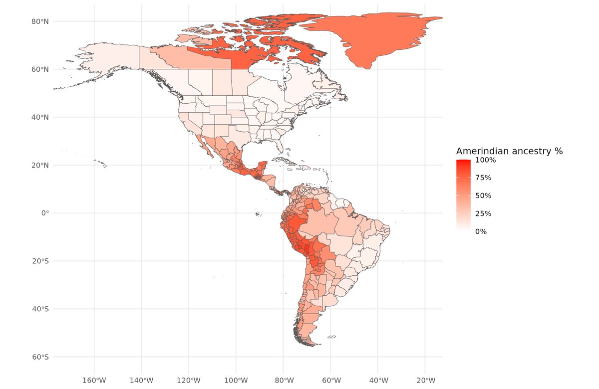 First, we compiled data from 100s of sources to estimate genetic ancestry for over 400 units in the Americas. These are countries and subnational divisions of the larger countries, such as US states, Canadian provinces, various Caribbean islands. Results can be seen in these 4 maps.