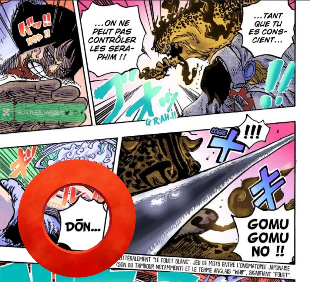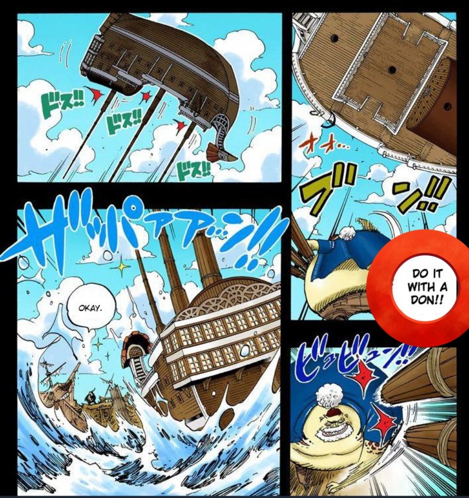 Don est une onomatopées qui apparaît depuis le début de OP, mais c'est bien un élément intrinsèque a l'oeuvre car Tom le citera a Franky ! Tom possède un tatouage du soleil et il dira ça au quai n°5, Luffy refera son panel d'attaque avec la même onomatopée en G5 !