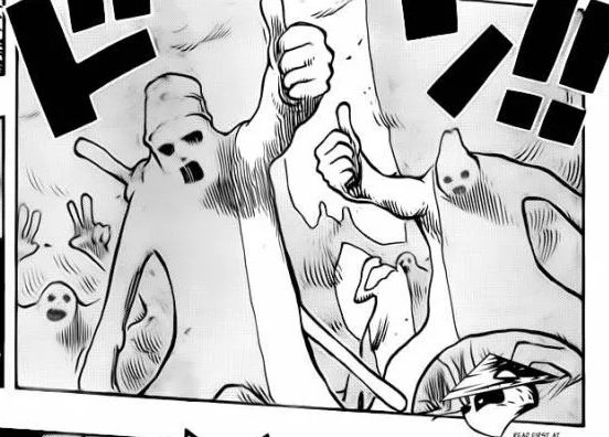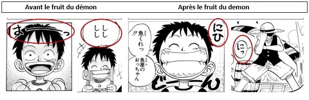 Puis après avoir mangé le fruit du démon dans le chapitre 1 les onomatopée ont changé ,Nihi (にひ),puis à Ni (にっ) après sa croissance.