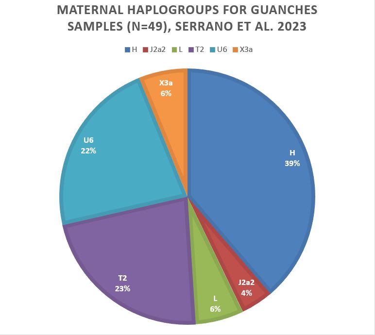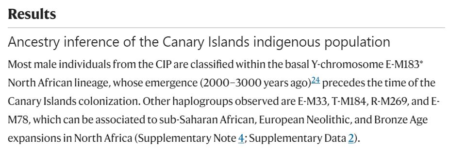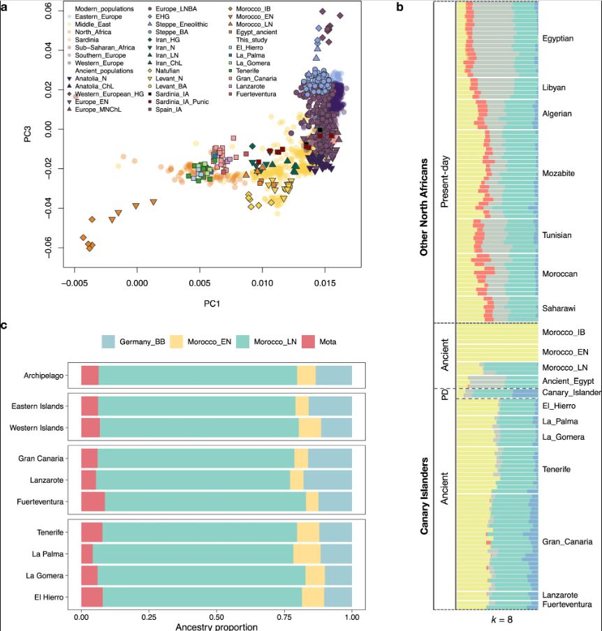 In terms of autosomal ancestry, the Guanches were once again found to cluster close to modern North Africans, with their ancestry being modelled as 73% Late Neolithic Morocco (Kef El-Baroud), 7% Early Neolithic Morocco (Ifri N'Ammar), 13% Germany_Bell Beaker and 6% Mota