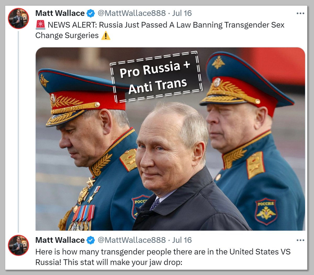 Besides this new fake, Wallace spreads the ‘Trifecta of Propaganda’ that any self-respected troll must share: Anti-vax, Anti-LGBT & Anti-Ukraine propaganda.