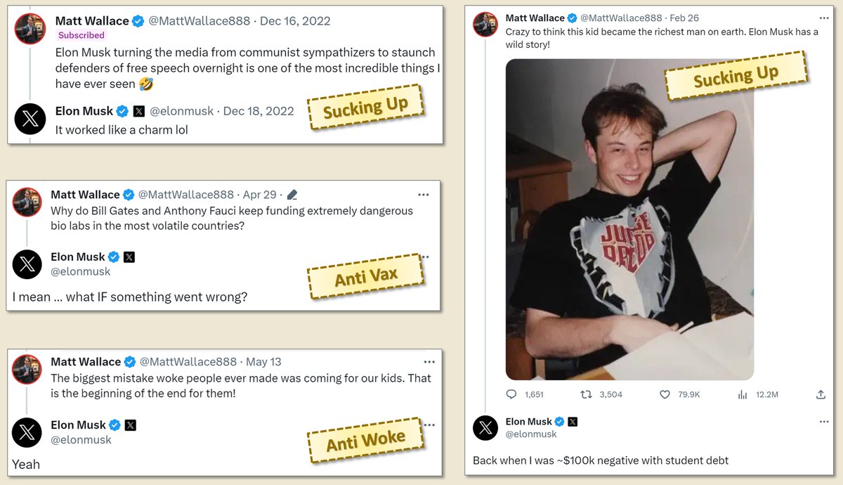 He constantly tweets everything Musk wants to hear: he tells him he’s a hero, that he fights woke & the media, and how everybody loves him.