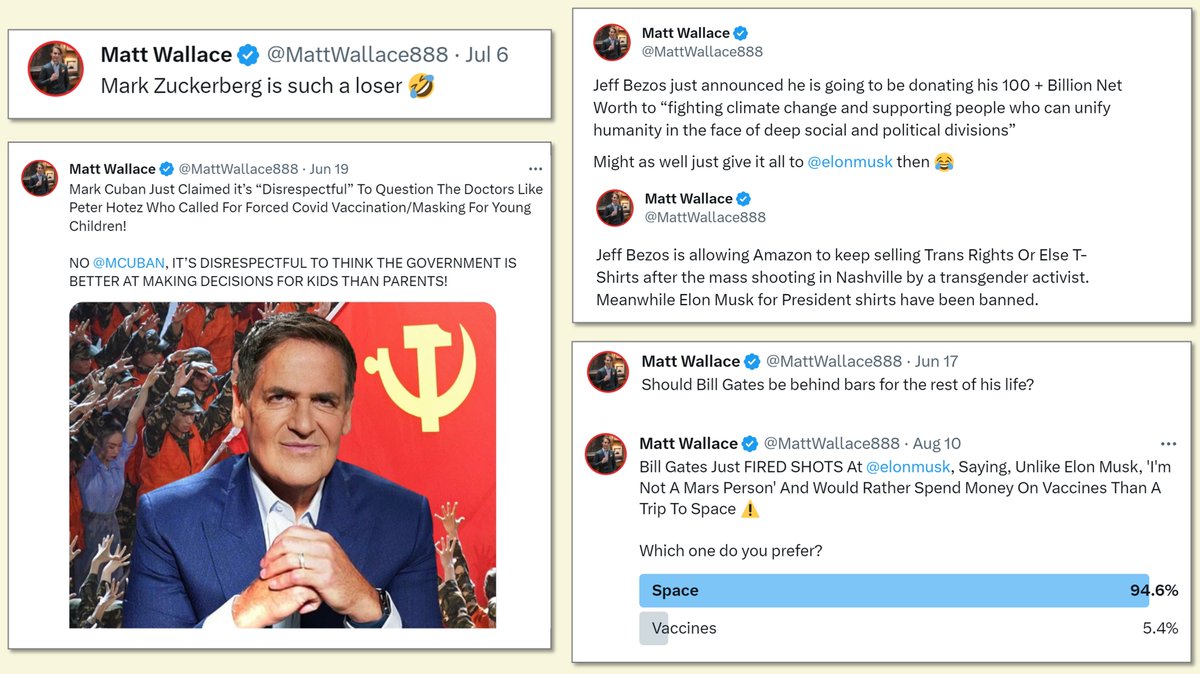 So, Wallace trashes Zuckerberg, Bezos, Cuban and Bill Gates. And now he has Musk in his pocket.