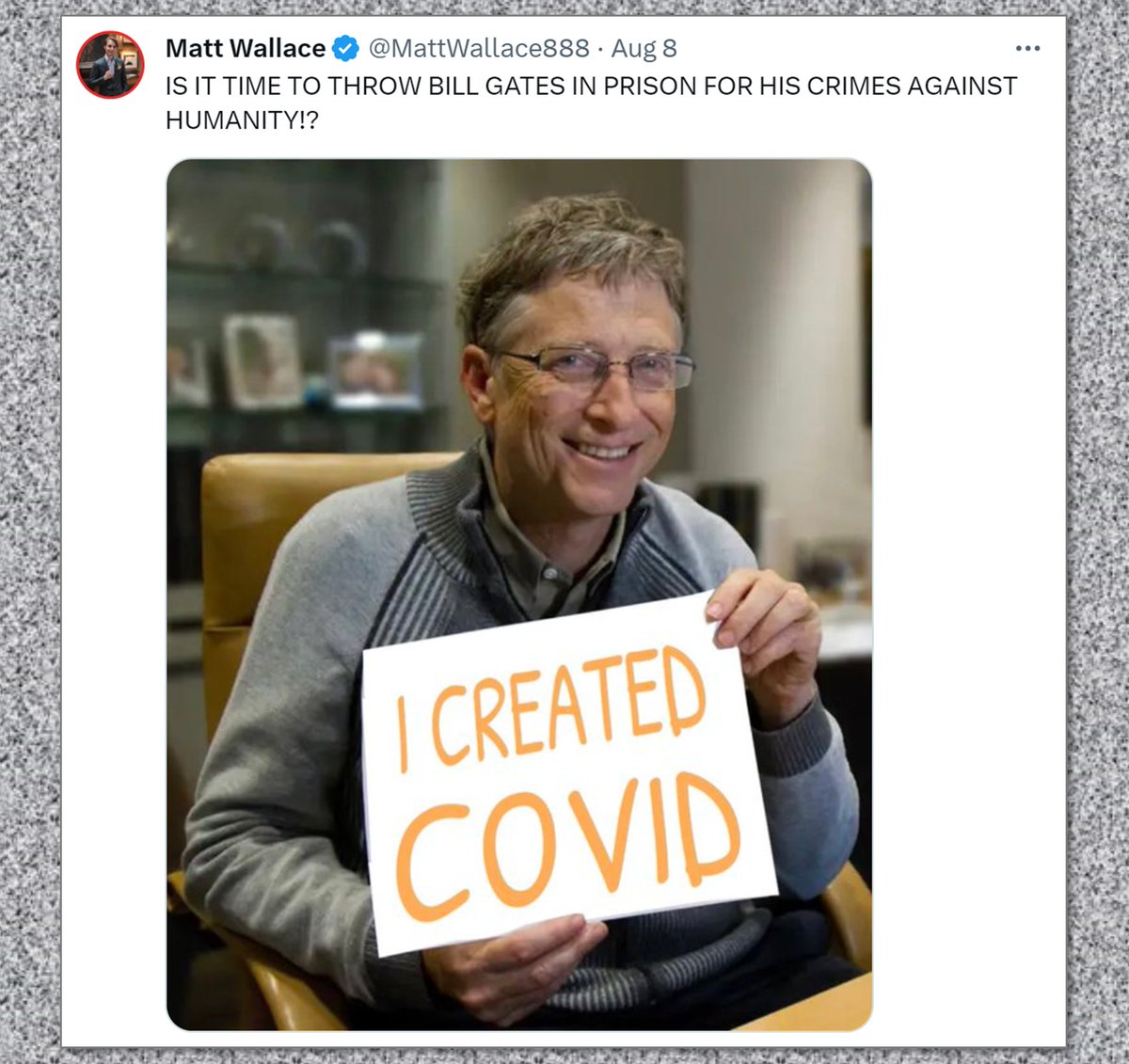 Because Bill Gates is the gateway to the second part of Wallace’s grifting: Conspiracy theories.