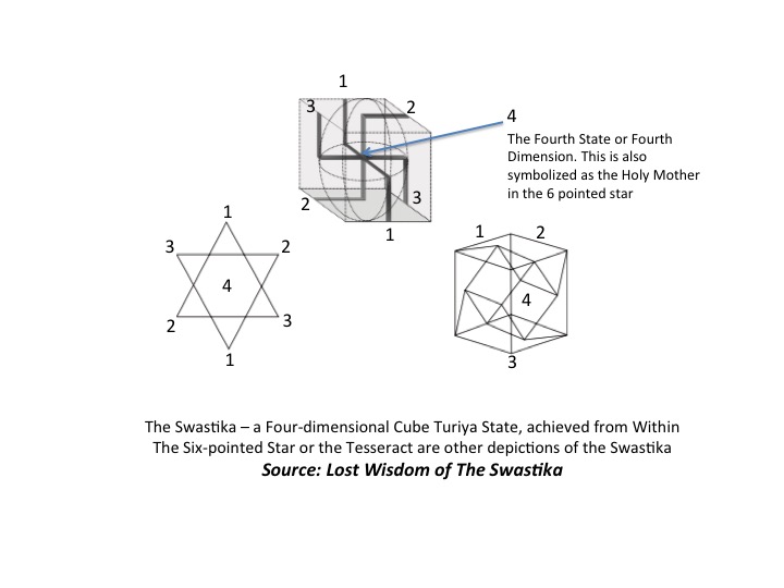 The Vedas talk of Four States of Being or Consciousness. The fourth state is known as the Turiya Avastha. The fourth state is beyond waking, sleeping and dreaming. It is the Fourth Dimensions accessed from WITHIN. The Symbol of the Swastika is that of a four-dimensional cube.