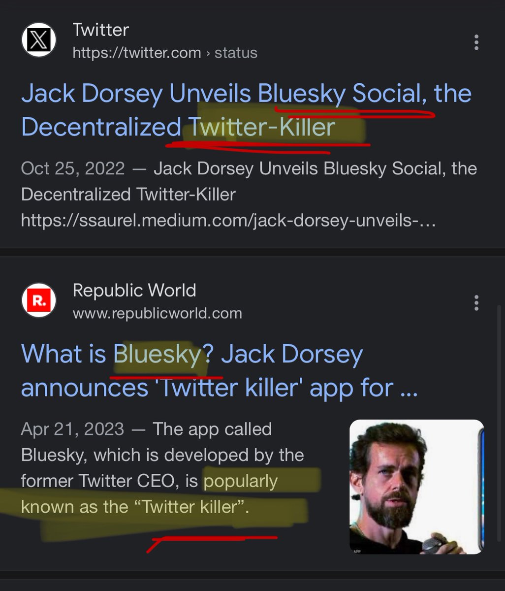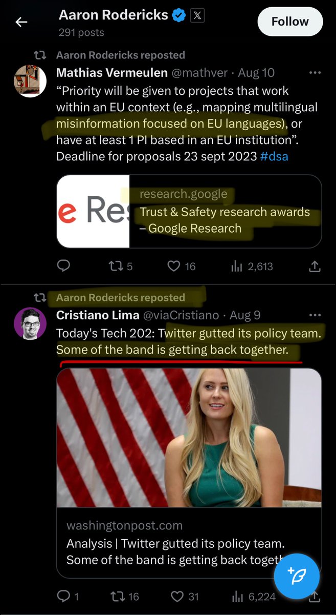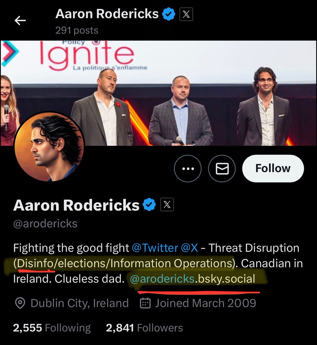Aaron Rodericks, who is hiring the new censorship squad at X, promotes his account on Bluesky (the “Twitter-killer” made by Dorsey after Musk took over!) in his own friggin bio