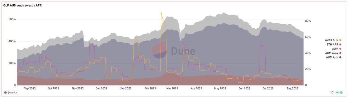 The success of GMX is strongly connected with the liquidity model GLP. At the recent top GLP had a TVL of $576m and undoubtedly started a wave of iterations, protocols building on top of it and utilisations of GLP for defi dapps (@muxprotocol, @Dolomite_io, @rage_trade,...)