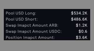 Example: There are $3.6k in the position impact pool for ARB-USDC. OI is lopsided $427k : $228k long : short.