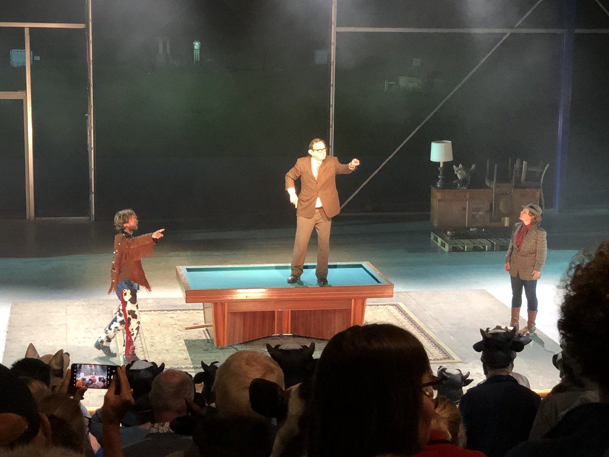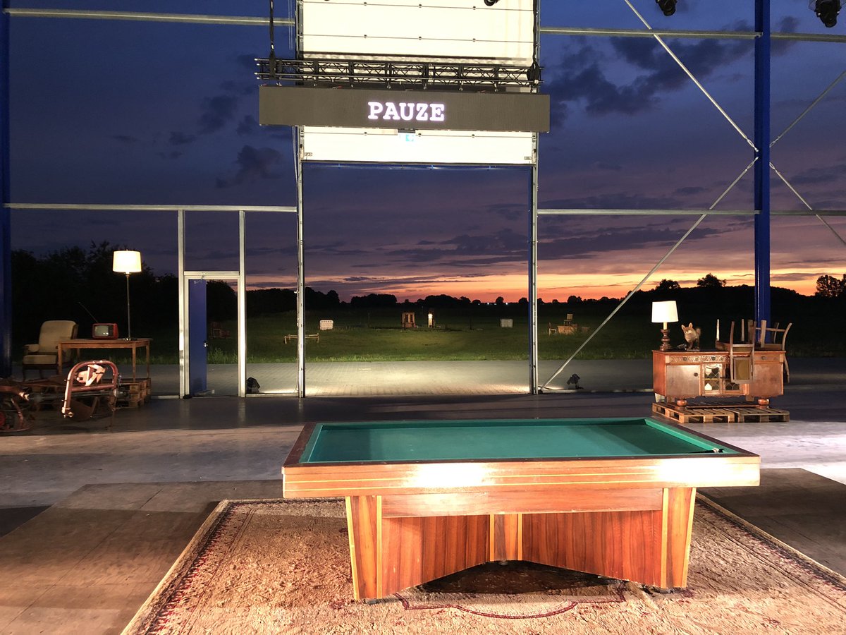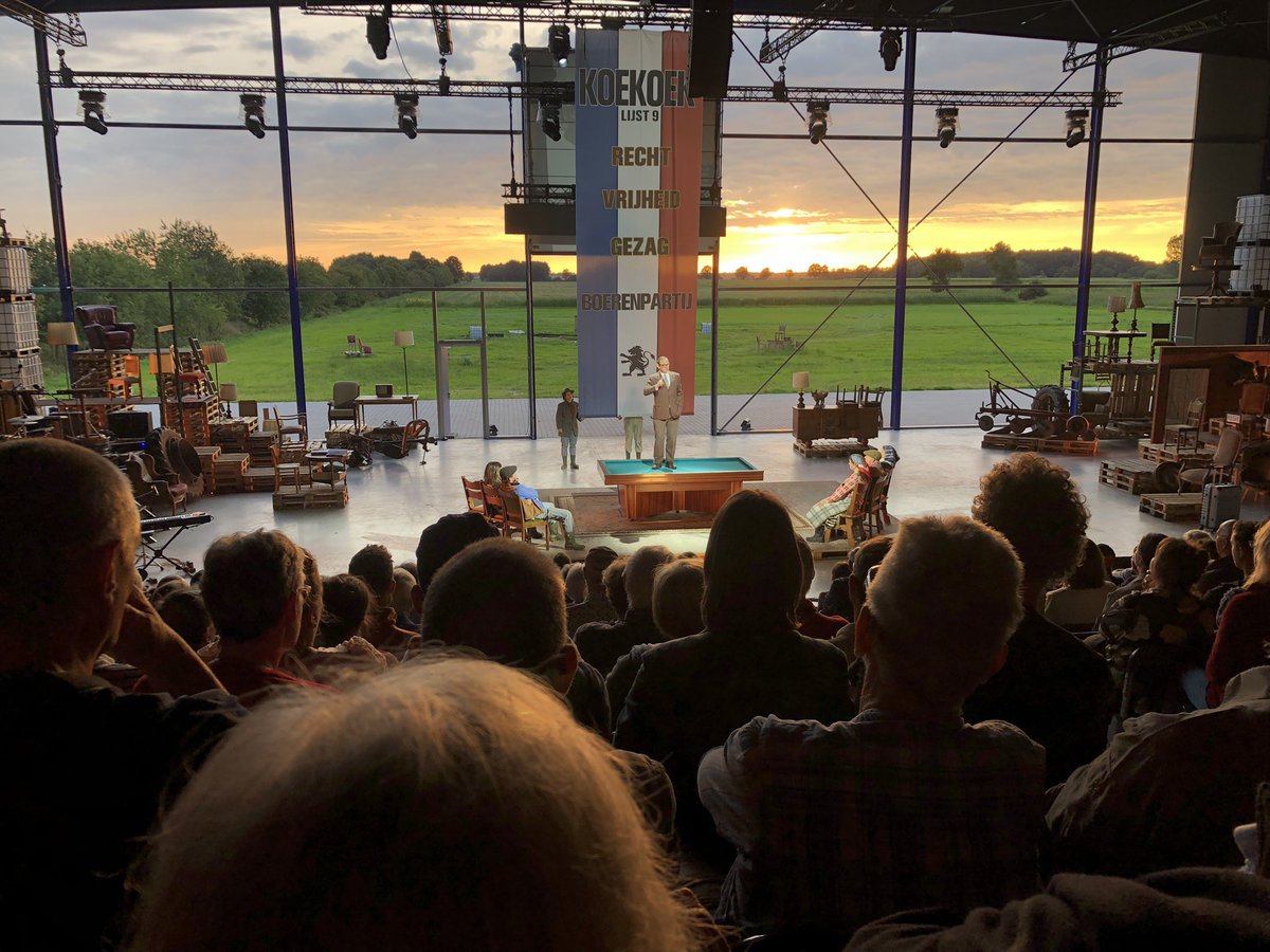 De toneelgroep kan nu niet verder met het stuk want het voldoet niet aan de stikstofnorm. Nu is besloten dat het dan maar een politiek protest is, dan kunnen we wel verder. Maar eerst pauze.