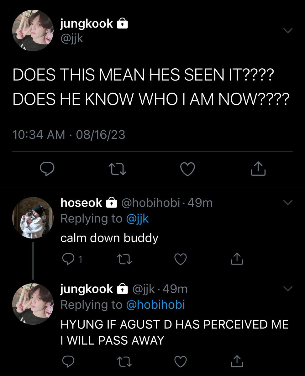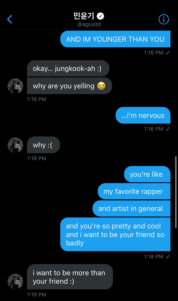 jungkook is an avid agust d fan, going to every concert and meet and greet that he can. yoongi, enamored with him, tells jungkook that it’s nice to see him again.