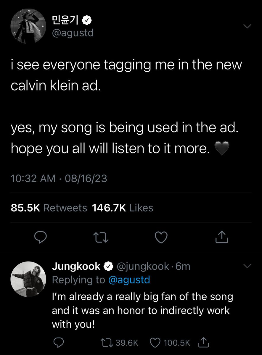 rapper yoongi’s song is used as the music for model jungkook’s new ad.