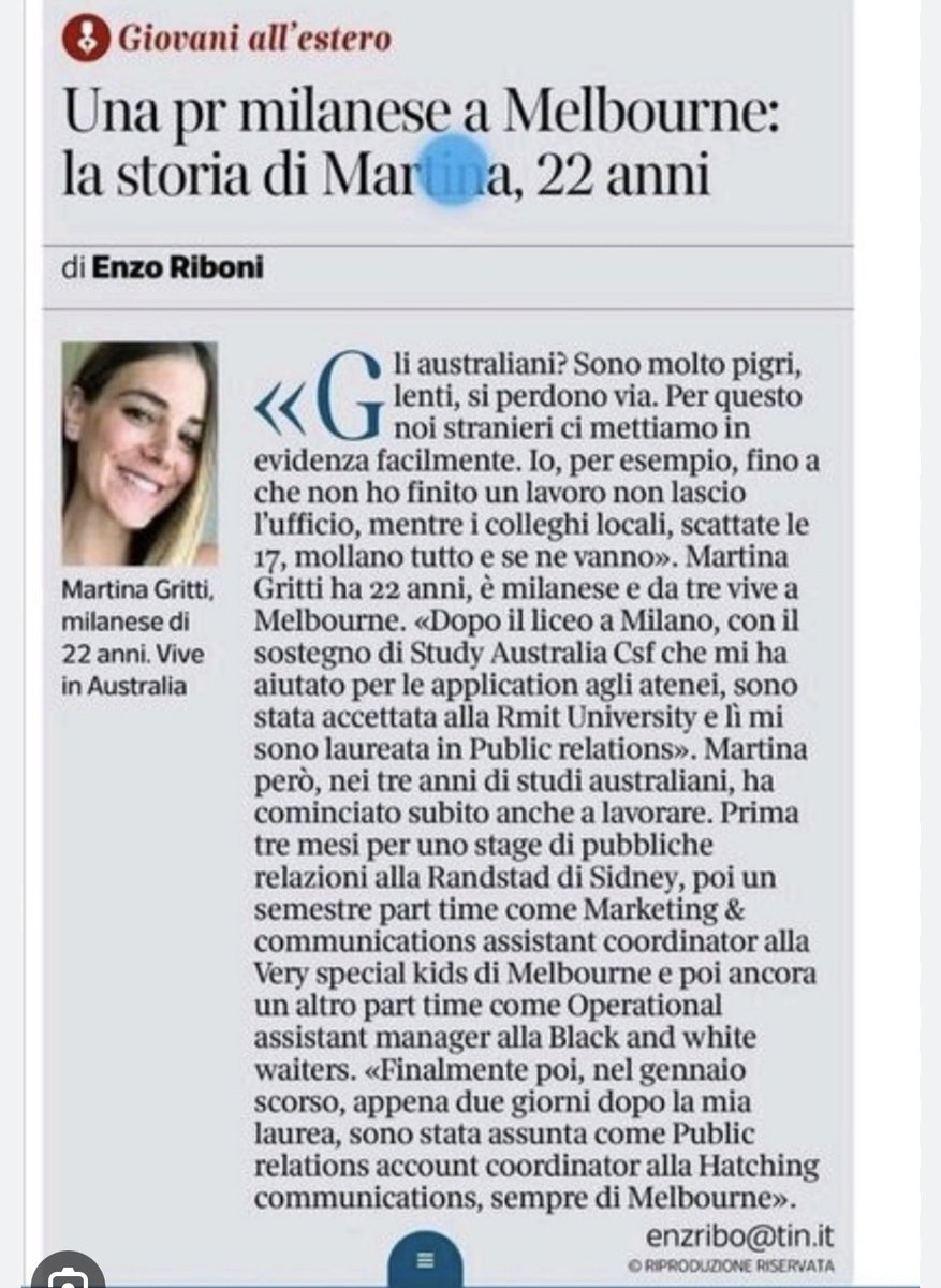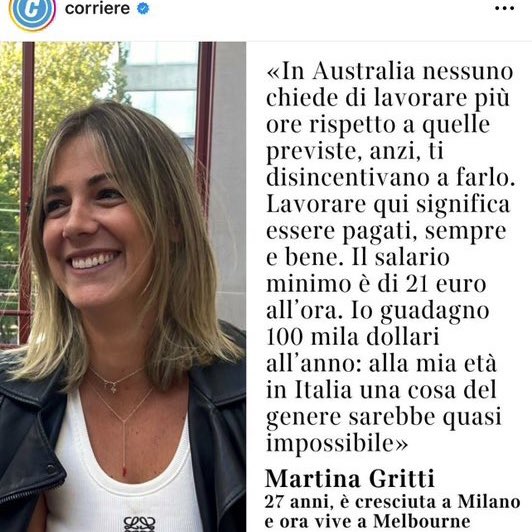 Infine, aggiungo che Martina Gritti incensa il valore del tempo libero che per gli australiani è sacro. Forse il Corriere non se lo ricorda, ma nel primo articolo elogiativo a lei dedicato 5 anni fa, la prodigiosa Gritti si lamentava degli australiani scansafatiche che vanno a casa finito l’orario di lavoro. Si vede che ora ha voglia di tornare a casa pure lei.
