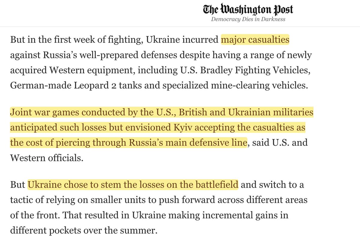 US-UK helped formulate a battle plan that "anticipated" Ukraine taking heavy losses. US-UK officials "envisioned Kyiv accepting the casualties as the cost of piercing through Russia’s main defensive line."