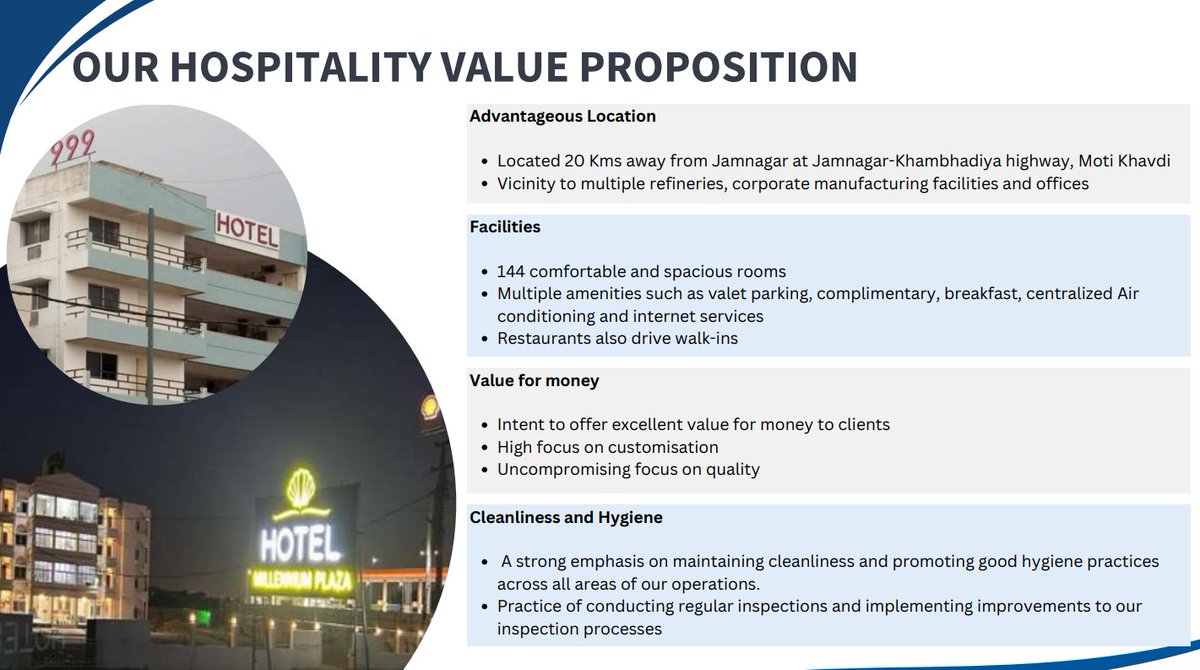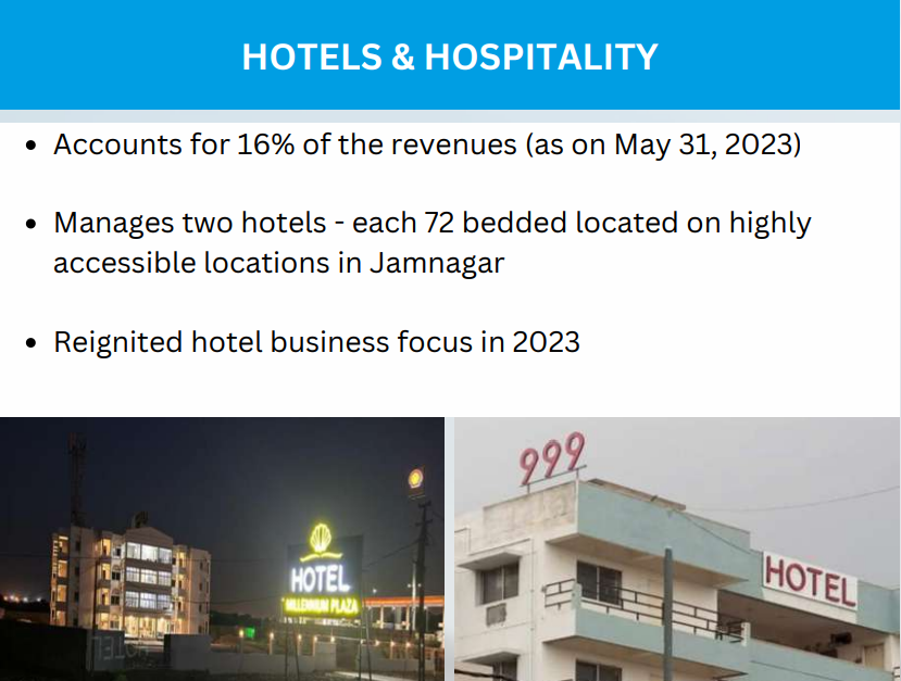 ii.Hotel and Hospitality: Under this vertical, the company operates two hotels, βHotel Millennium Plazaβ and βHotel 999,β both located in Jamnagar City, Gujarat. Each hotel offers 72 well-furnished rooms and contributes to the companyβs revenue through the hospitality business(3)