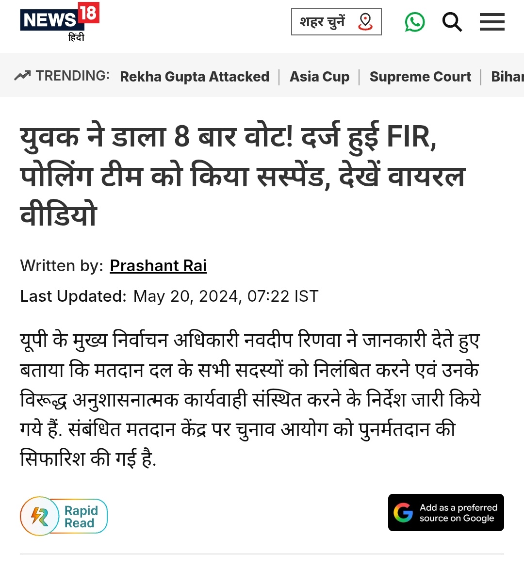 FACTS : Video 1 : The boy who claims to be son of a Gram Pradhan had voted 8 times in UP's Farrukhabad constituency. But to say no action was taken is completely wrong and misleading. The boy was arrested, all officials from the polling booth were suspended and repolling was ordered as well.