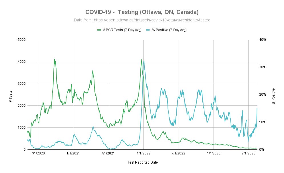 Ottawa PCR test positivity has also been increasing quickly. The # of tests being done daily now is about 10x less than this time last year and almost 100x less than 2021. This also makes it much more difficult to detect new variants that may cause significant issues. 6/