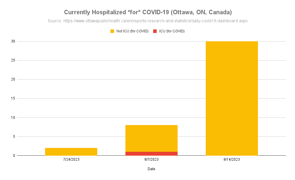 With increased transmission and infection also brings an increase in hospitalization. In late July there were only 2 people hospitalized *for* COVID-19 in Ottawa, two weeks ago that increased to 8, and there are 30 people as of last week. 7/