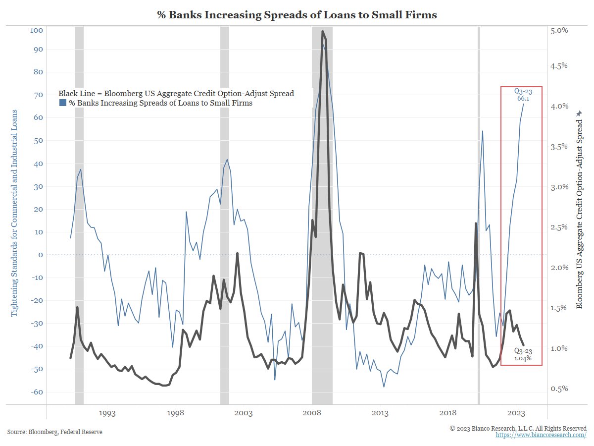 And what are banks doing because of the Bank Walk? They are squeezing everyone with tighter lending standards and much wider spreads (blue).
