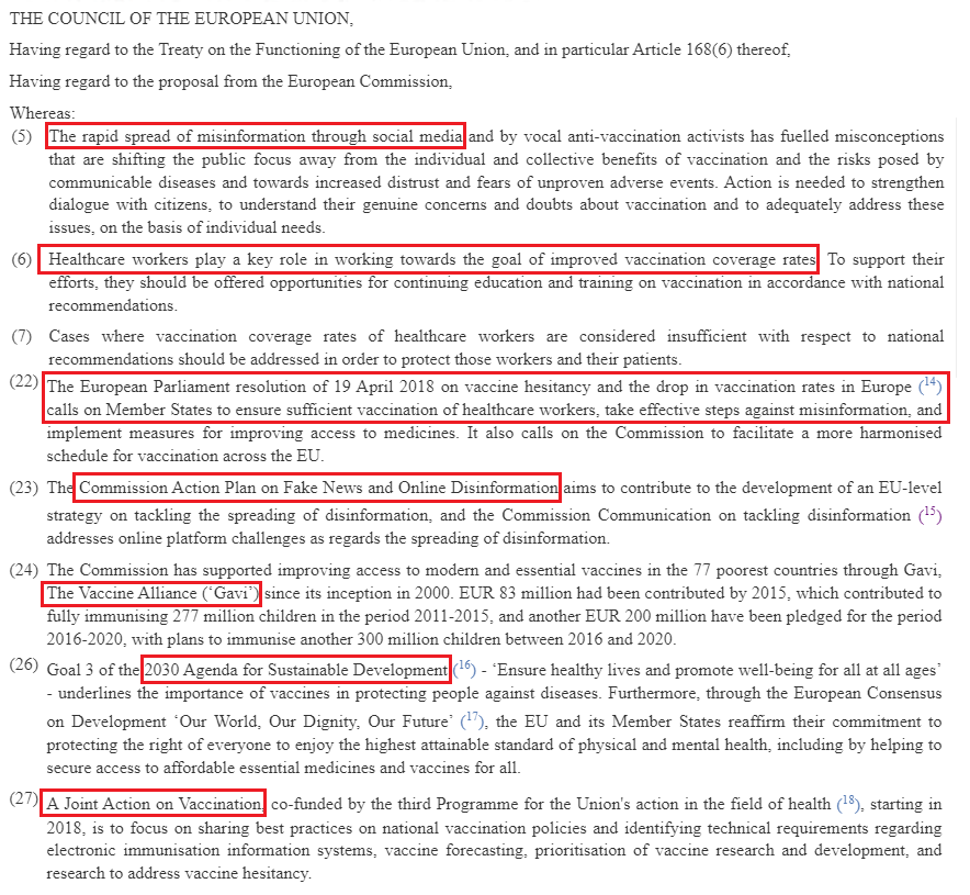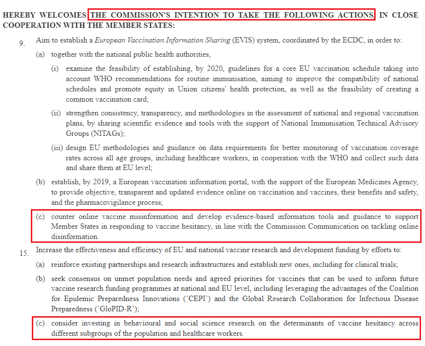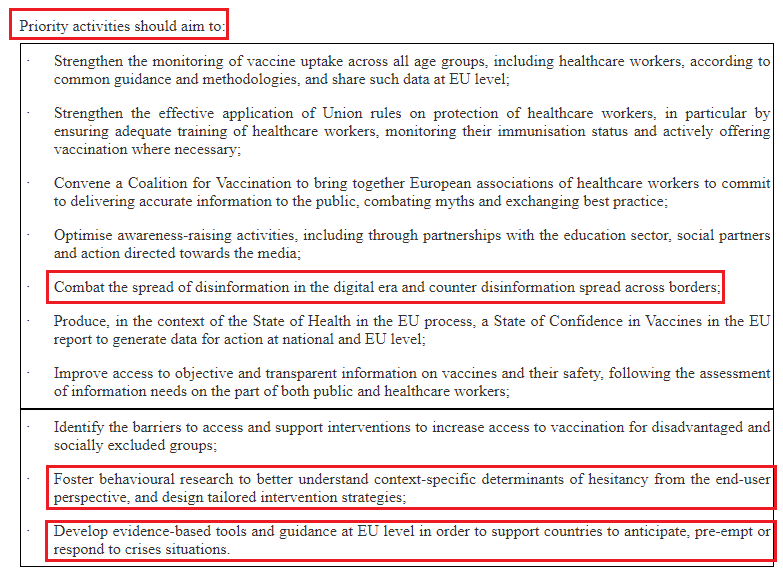De EC uit een aantal acties voor samenwerking tussen de lidstaten. Actiepunten 9c en 15c bestaan uit het bestrijden van online desinformatie en het investeren in gedragswetenschappelijk onderzoek om de terughoudendheid ten aanzien van vaccinaties tegen te gaan.