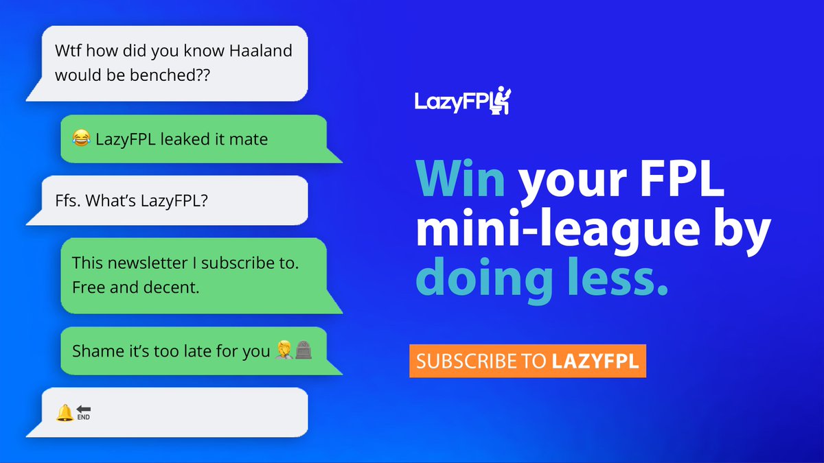 @LazyFPL's pre-deadline emails will help you to win your mini-leagues without breaking a sweat. 99.2% of their readers agree. They’re totally free.