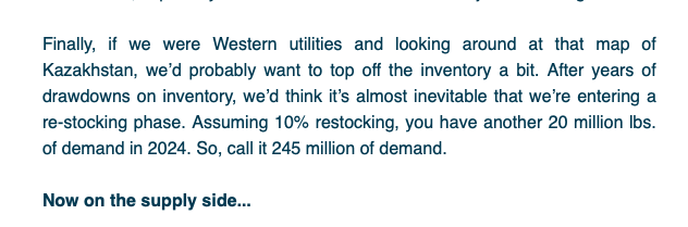 Western utilities observing Kazakhstan might be entering a re-stocking phase. After continuous inventory reduction, an extra 20 million lbs might be needed in 2024.