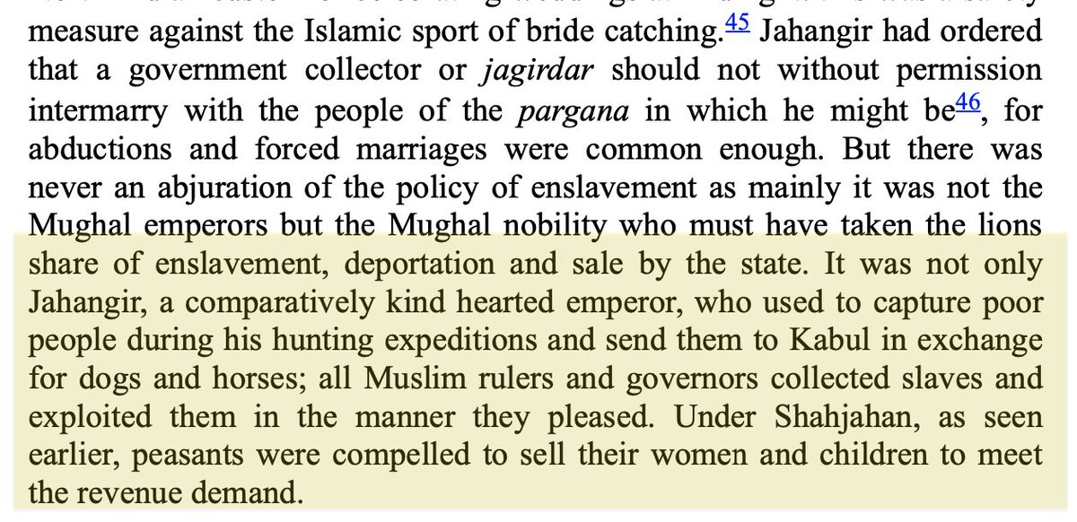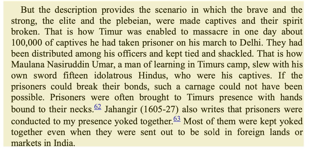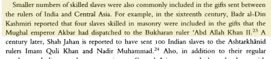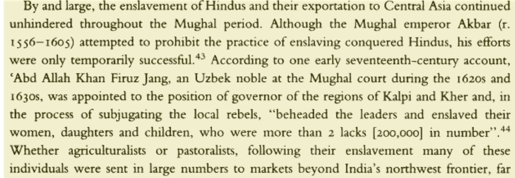 In the 16th c. Akbar the “Great” sent skilled Hindu artisans as gifts to Muslim kings. Jahangir enslaved many Hindus during his hunts & traded them to Kabul for dogs & horses. Jahangir’s Uzbek governor massacred 1000s to enslave 2 Lakh Hindu women & children in Kalpi & Kher.