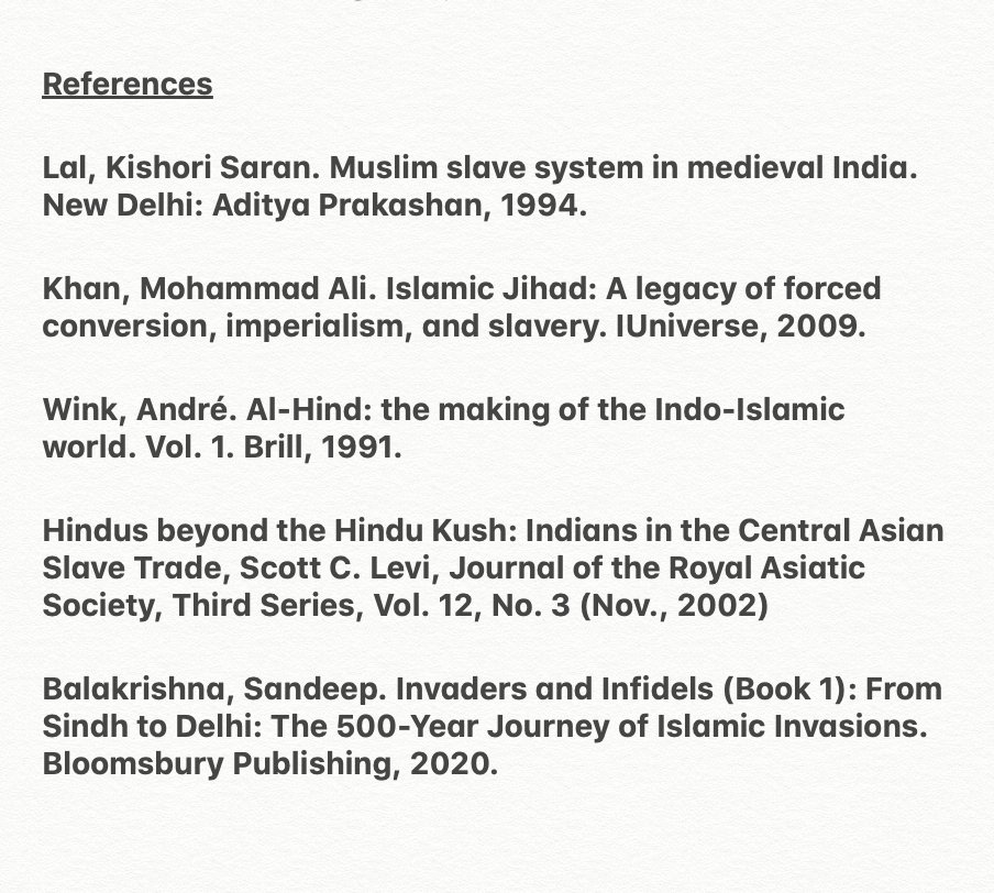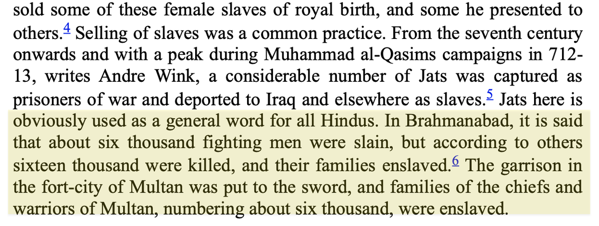 In 8th c. after 14 failed Arab attempts, Qasim finally conquered Sindh. He massacred 6000 men & enslaved 60,000 women & kids in Rawar. In Brahmanabad 16,000 were killed & 1000s enslaved. Qasim kept 1/5 or 20,000 for himself which means 1 Lakh+ slaves were captured from Sindh.