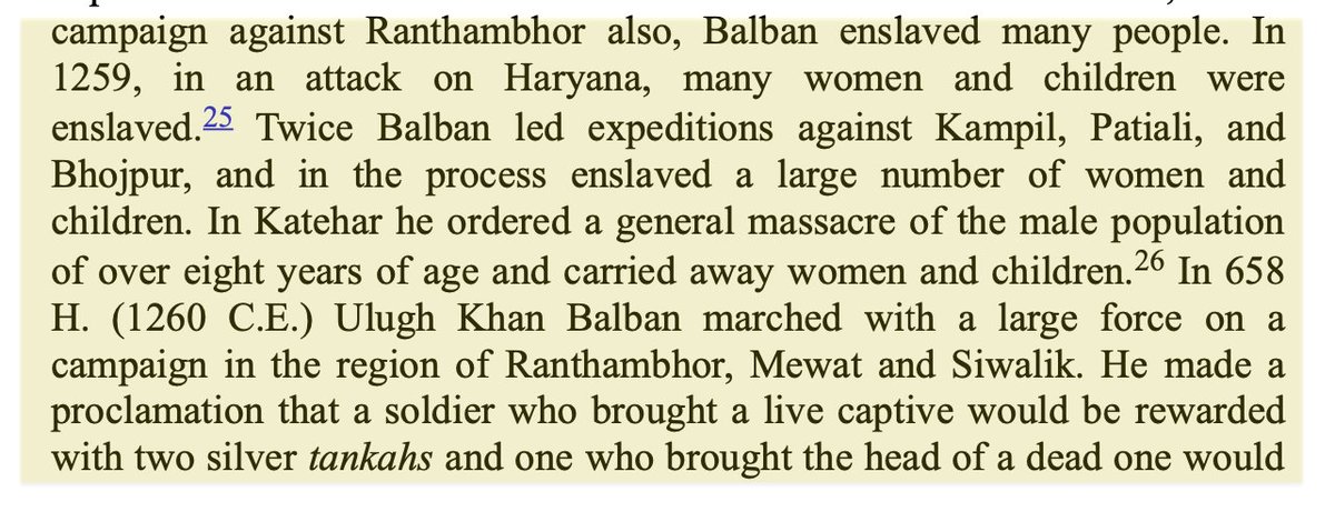 In early 13th c. Balban massacred & enslaved 1000s in Ranthambore, Kampil, Patiali, Bhojpur, Katchar, & Mewat. He ordered general massacre of any Hindu male over 8 yrs & enslaved all the women & children. Capture of a live slave earned 2 Tankah & a Hindu's head earned 1 Tankah