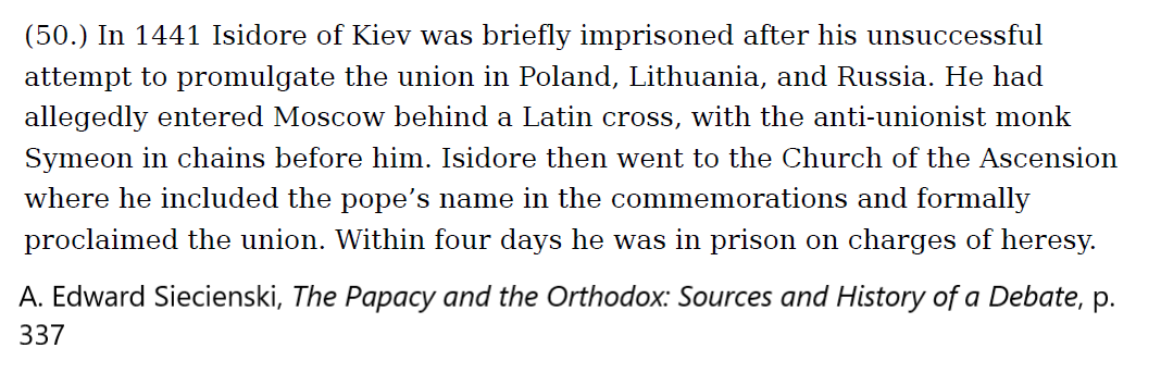 New Advent, 100+ year old Catholic encyclopedia, admits Russian Metropolitans from the beginning to Met Isidor of Kiev (1437 AD) had no relations with Rome & literature of this time characterizes the Latins as schismatics & heretics & even canonical documents label Latins pagans.