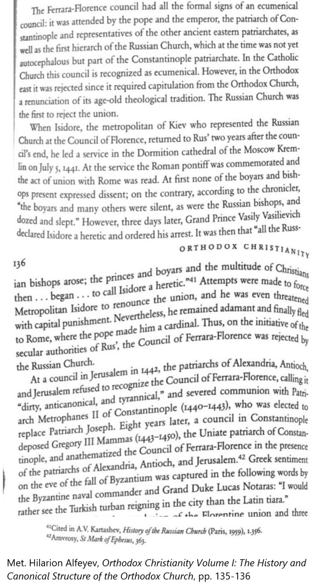 Why did Isidore of Kiev come to Florence (1438-39) if any union was there? Reaction of Russian faithful to the council led to Russian Orthodox Church declaring itself autocephalous (independent) from Constantinople. Russia was 1st to reject. Isidore was quickly declared a heretic