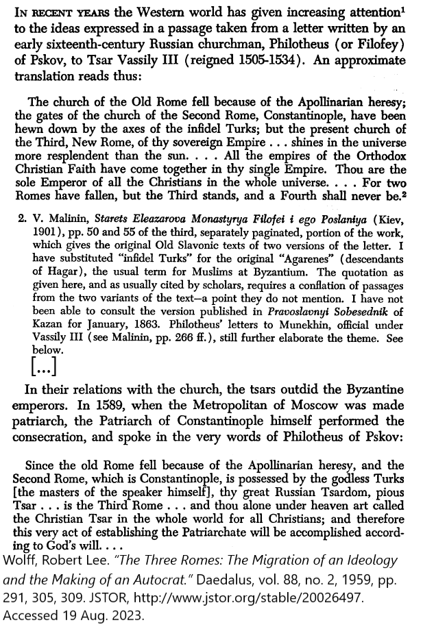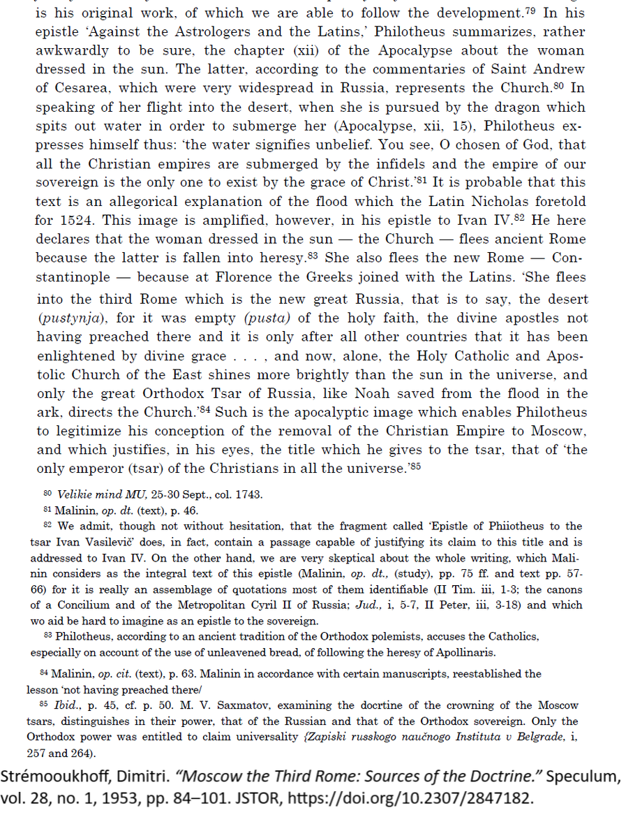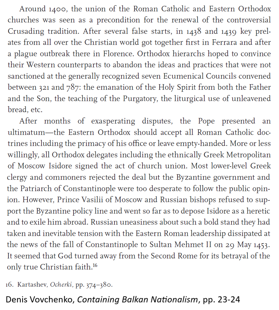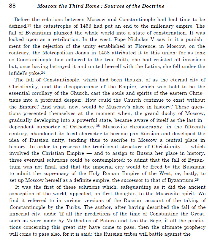 After Florence, there was sentiment among Orthodox Russians Constantinople fell for heresy by accepting the council despite most eastern Roman lower-level clergy & laity not supporting this council. Orthodox Muscovites felt they were the last true free Christian people on earth.