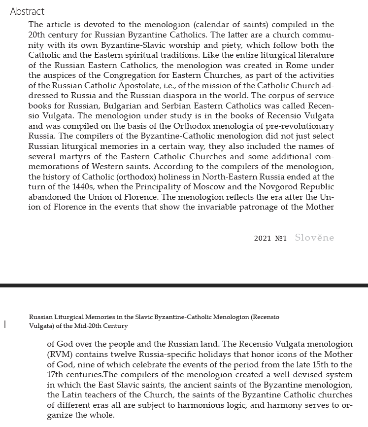 A scholarly paper on Russian Liturgical Feast Days in the Slavic Byzantine Catholic Menologion of the Mid-20th Century. According to official compilers the Catholic history of Rus' ended only at 1440s when Rus' rejected Florence, not Great Schism of 1054. slovene.ru/2021_1_Semenen…