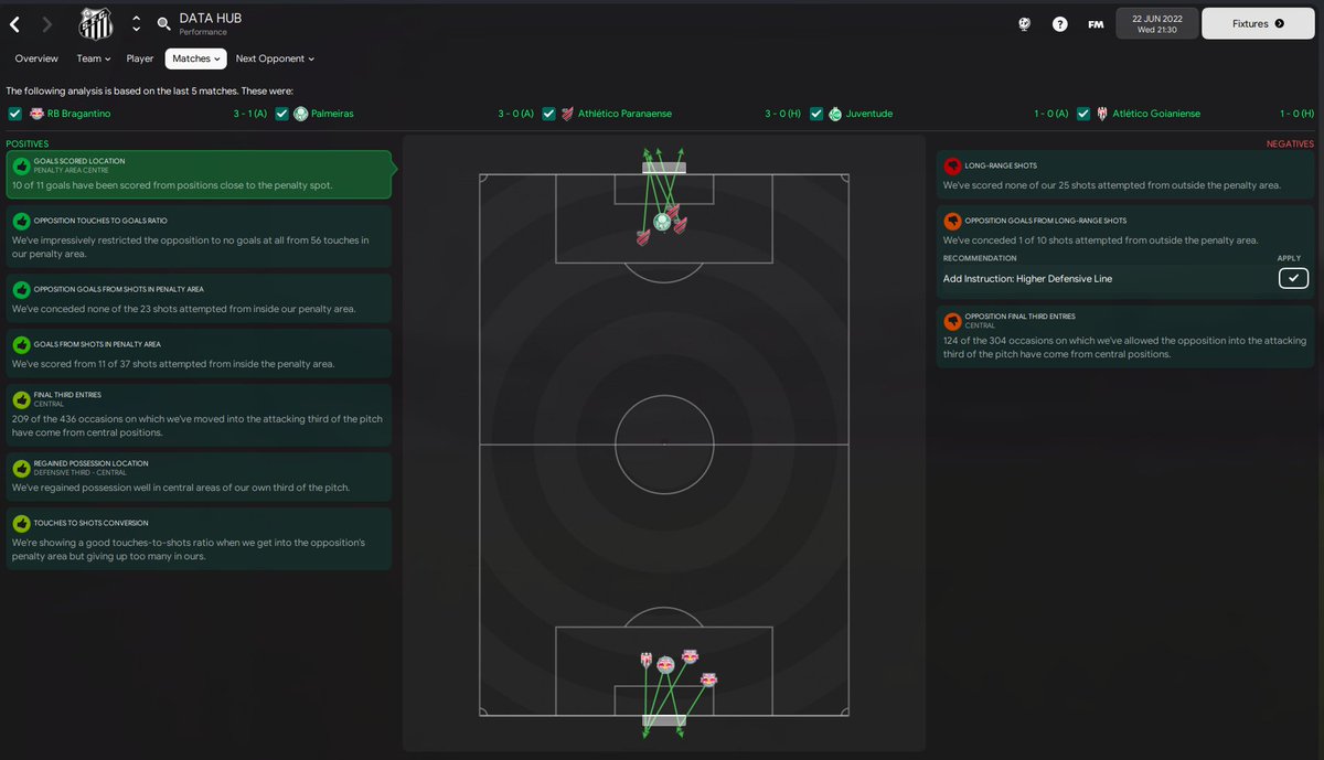 We can see tactical trends here too both good and bad. You can also click the checkbox on any of the 5 games to exclude them from the data too, so you can see which issues arise in which games and how the trends change. It might also throw up different trends that aren’t currently listed too. Let’s start with all the good things my current tactic does though before discussing the issues.