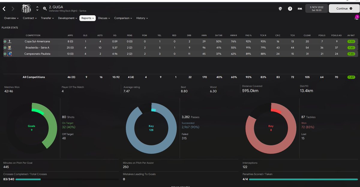 Passes attempted and pass completion rates are very high due to him being the absolute start of everything, with us playing out from the back. Overall he’s had a fantastic season both defensively and offensively. #FM23