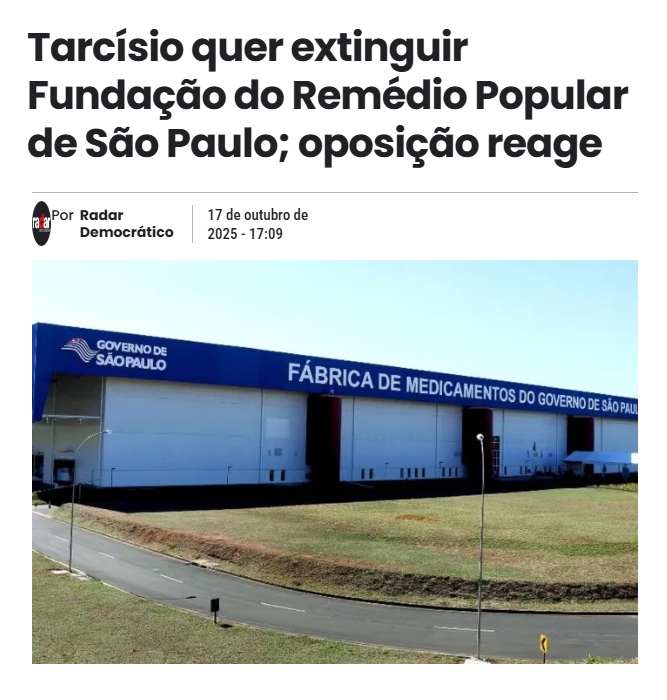 Está avançando na Assembleia Legislativa de São Paulo o PL 49/2025, oriundo da base de apoio do governador Tarcísio de Freitas, que prevê a extinção da FURP — a Fundação para o Remédio Popular, laboratório público que que produz medicamentos de baixo custo para o SUS.