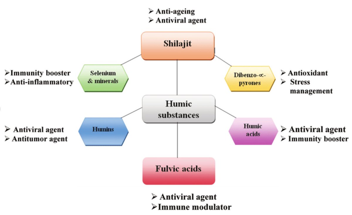 Le shilajit se compose principalement de substances humiques, notamment d'acide fulvique (qui représente environ 60 à 80 % du composé nutraceutique total), d'acide humique et d'autres minéraux, dont le sélénium.