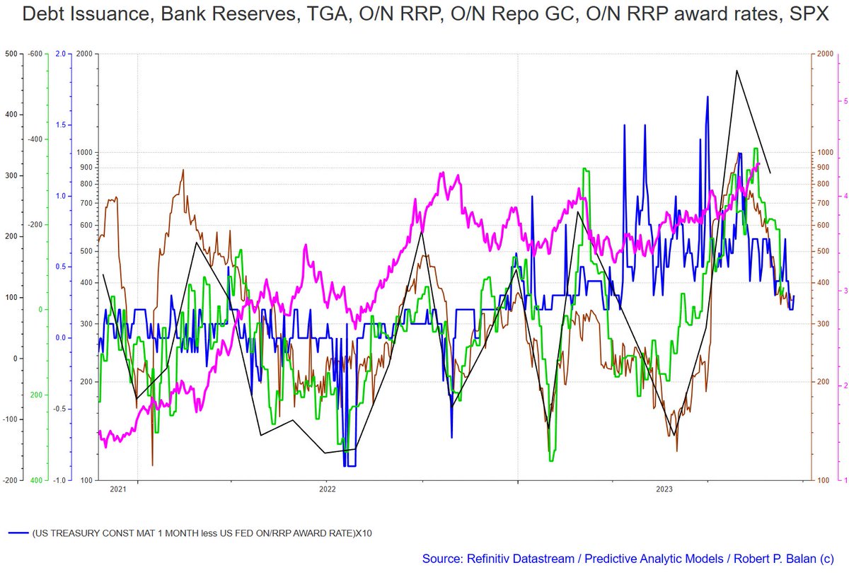 I am looking at the way pure T-Bill Issuance has screwed the entire liquidity process. The weird, variable covar between the Yield and SPX started when the Treasury massively issued T-Bills, and Bills alone (see chart below), as from May 29.