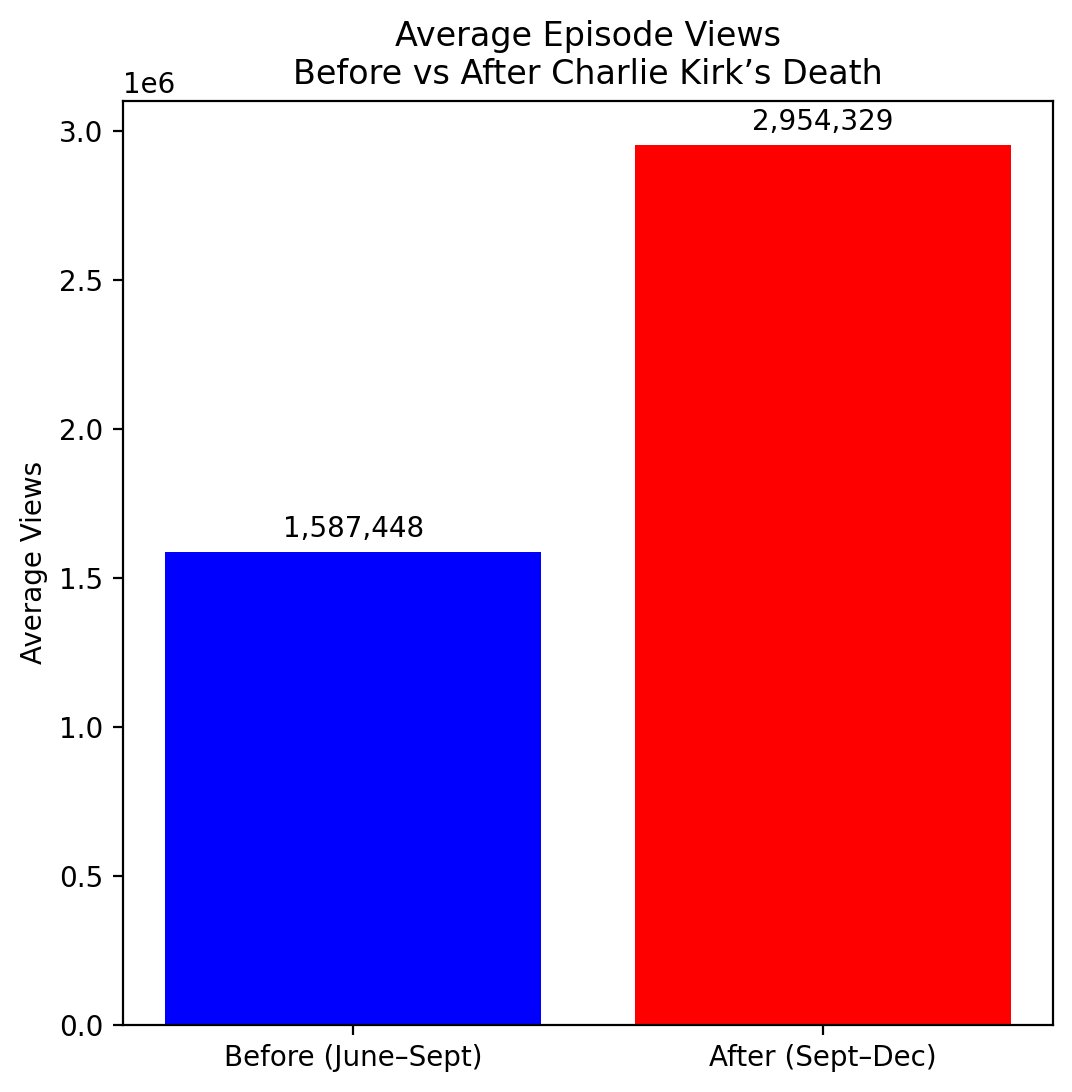 After Charlie’s death, Candace Owens’ audience surged immediately - rising to an average of 2.95M views per episode, an 86% jump over her prior baseline.
