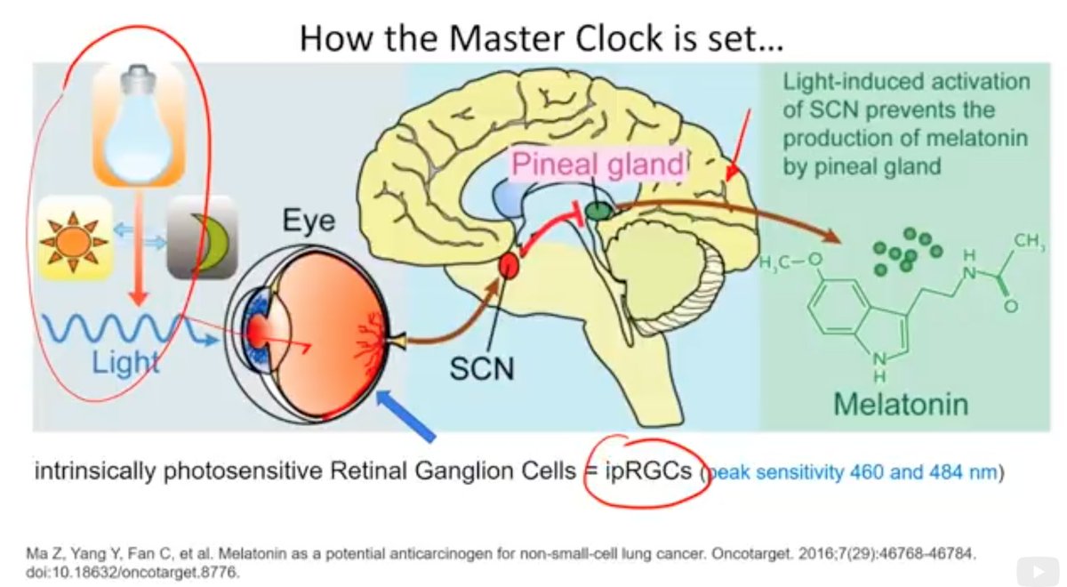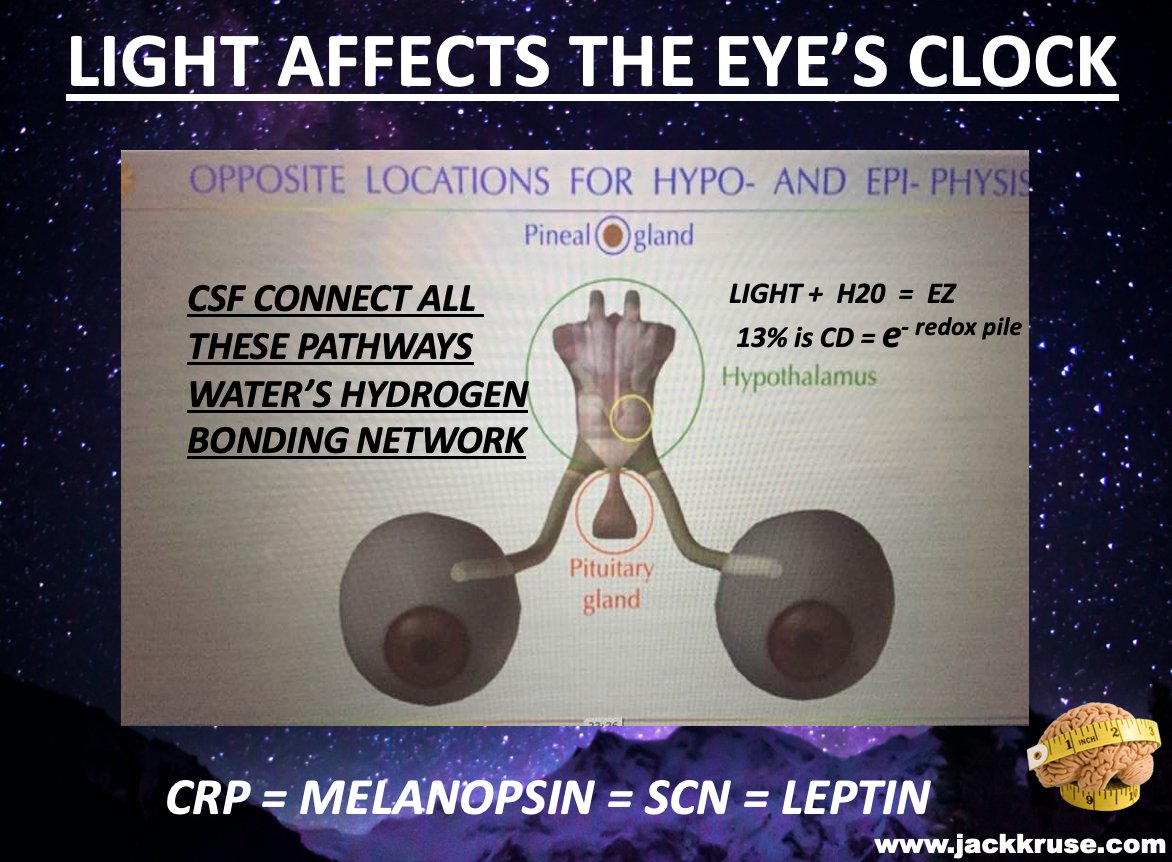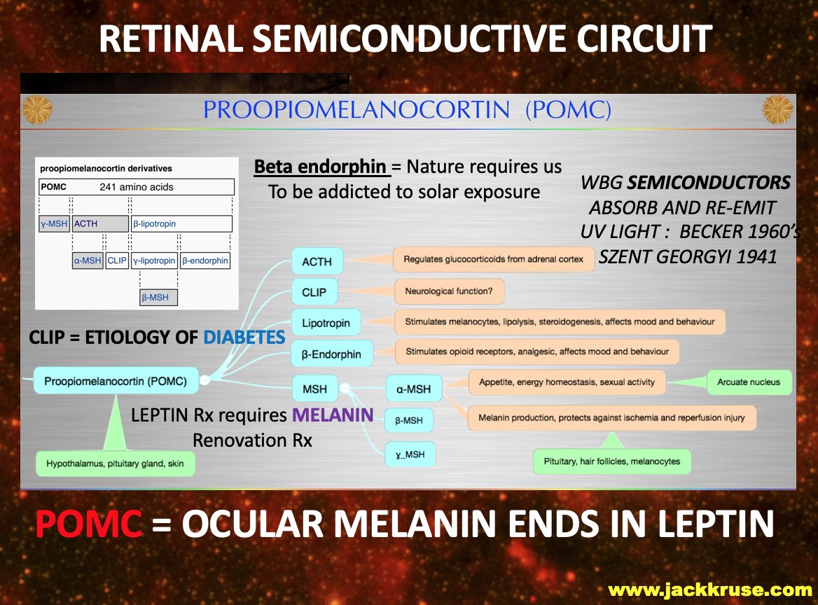 4. In the light environment your eye, skin, and aero-digestive system pay attention to this atomic molecular design. It is the key to understanding how health remains. Just as a semiconductor fab plant requires atomic precision and has no room for dirt on its wafers, the fidelity of your design is more precise. The information comes from the penetration of sunlight via the pupils and it first targets the RPE of your retina. The mitochondria of your retina focus this light precisely to jettison across the central retinal pathways while creating POMC and then they target the hypothalamus, midbrain, and thalamus.