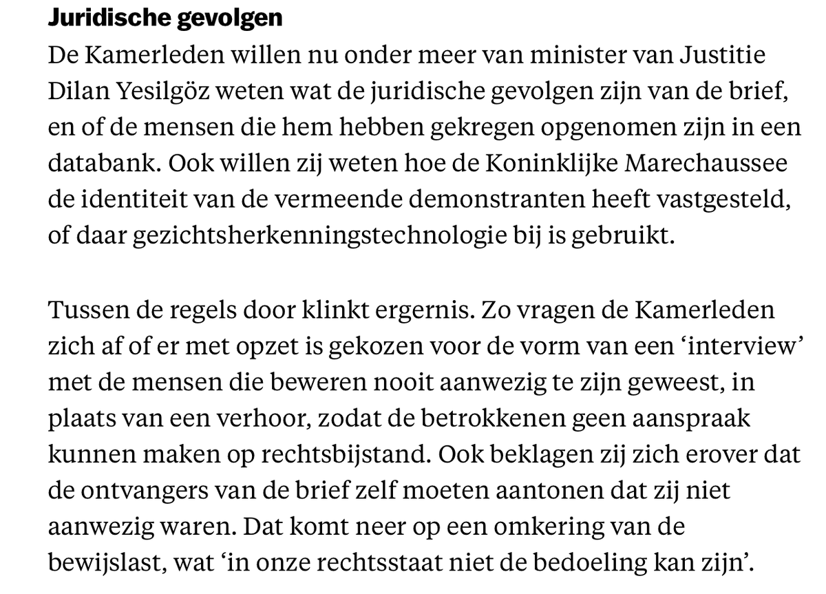 De inzet van gezichtsherkenning is meestal juridisch helemaal niet in de haak. Ooit ingevoerd om terroristen of kindermisbruikers te kunnen pakken, maar bij een demonstratie ingezet. Dat is een glijdende schaal, zegt onze @lot_ten in het @parool