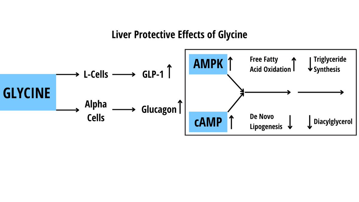 Glycine has many liver protective effects by stimulating glucagon-like peptide 1 (GLP-1) and glucagon, which then helps to prevent liver fat storage through AMPK and cAMP