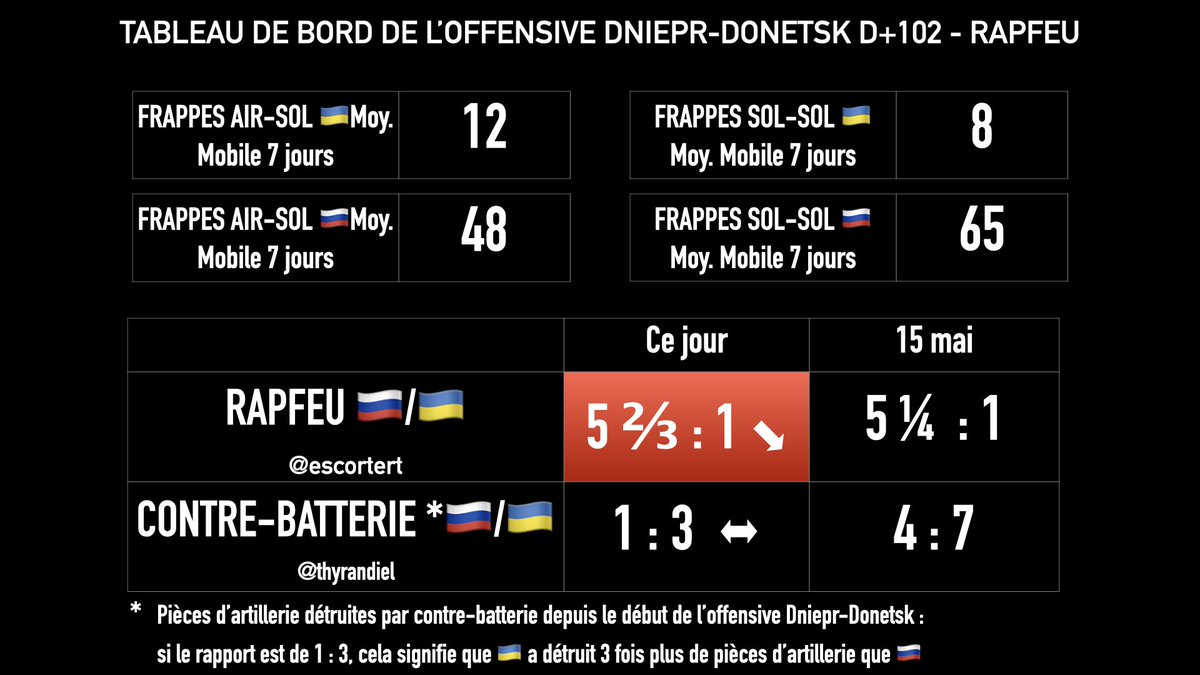 Il y a un regain des feux 🇺🇦depuis plusieurs jours ce qui diminue le RAPFEU autour de 5 : 1 au profit des 🇷🇺 alors qu'il avait culminé jusqu'à 8 : 1, en raison d'une faiblesse inhabituelle côté 🇺🇦