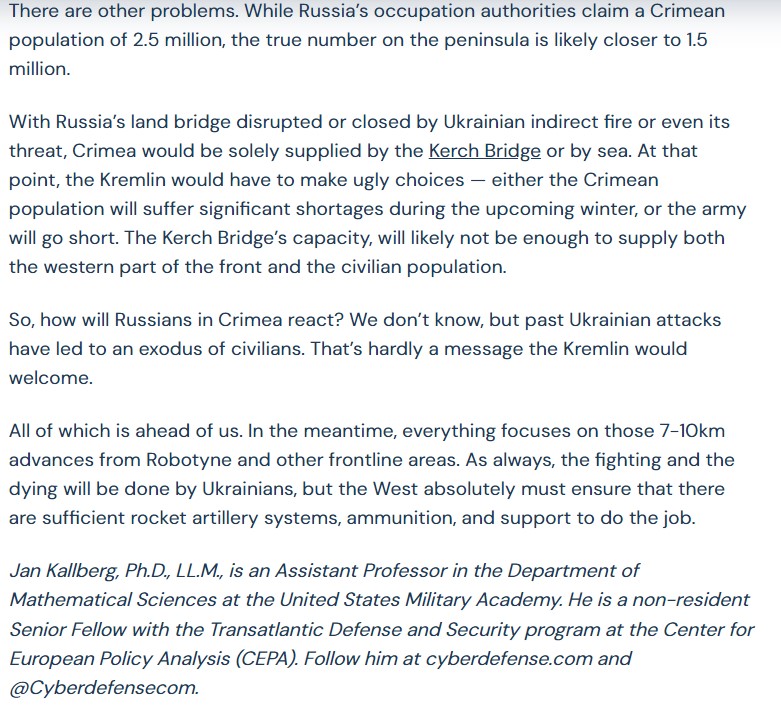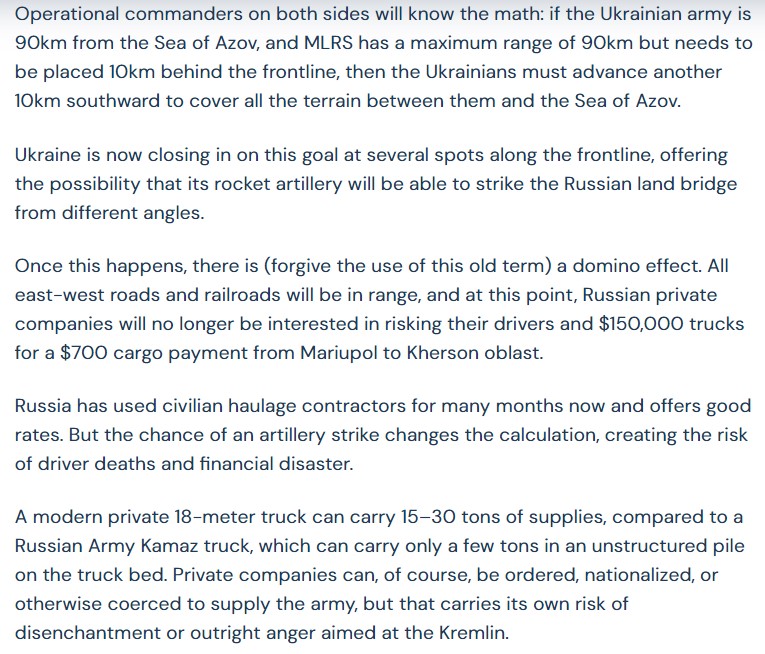 The previous strikes on Crimean rail bridges, the more recent ones on the Henichesk, Chonhar, & Kerch bridges, interwoven with the systematic destruction of ammo/fuel depots in Southern Ukrainian and Dzhankoy Crimea, means that the "land bridge" that goes through Rostov-on-the 2/
