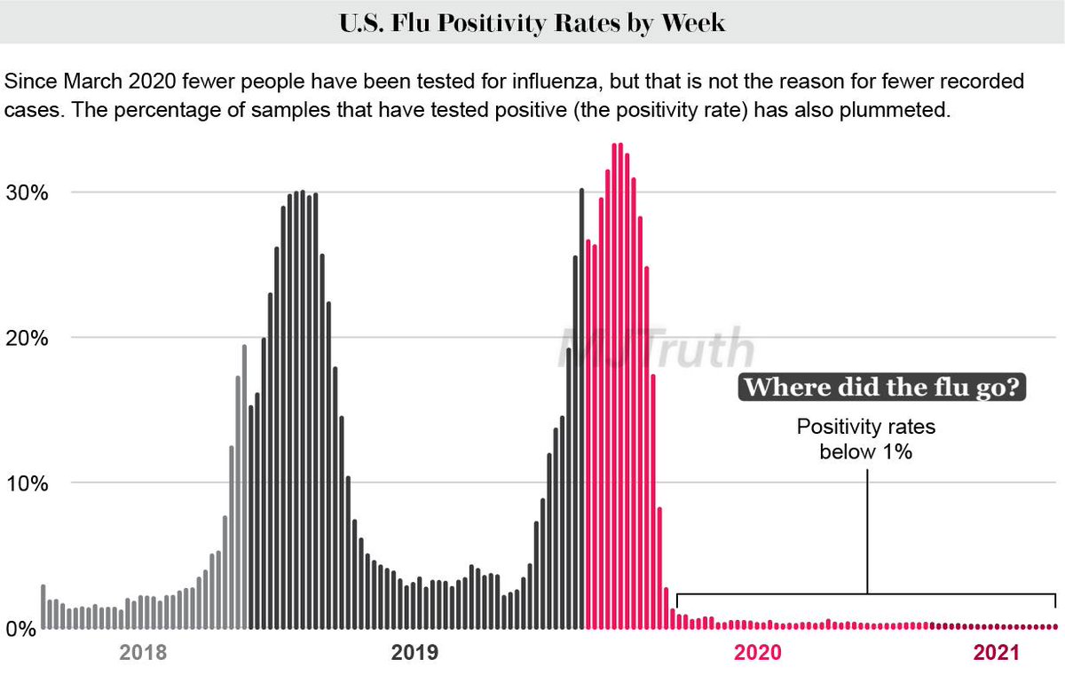 According to CDC & WHO data, as well as scientific journals, since November 2020, the drop-off in flu numbers following COVID’s arrival was swift and global, which caused a less than 1% positivity rate.