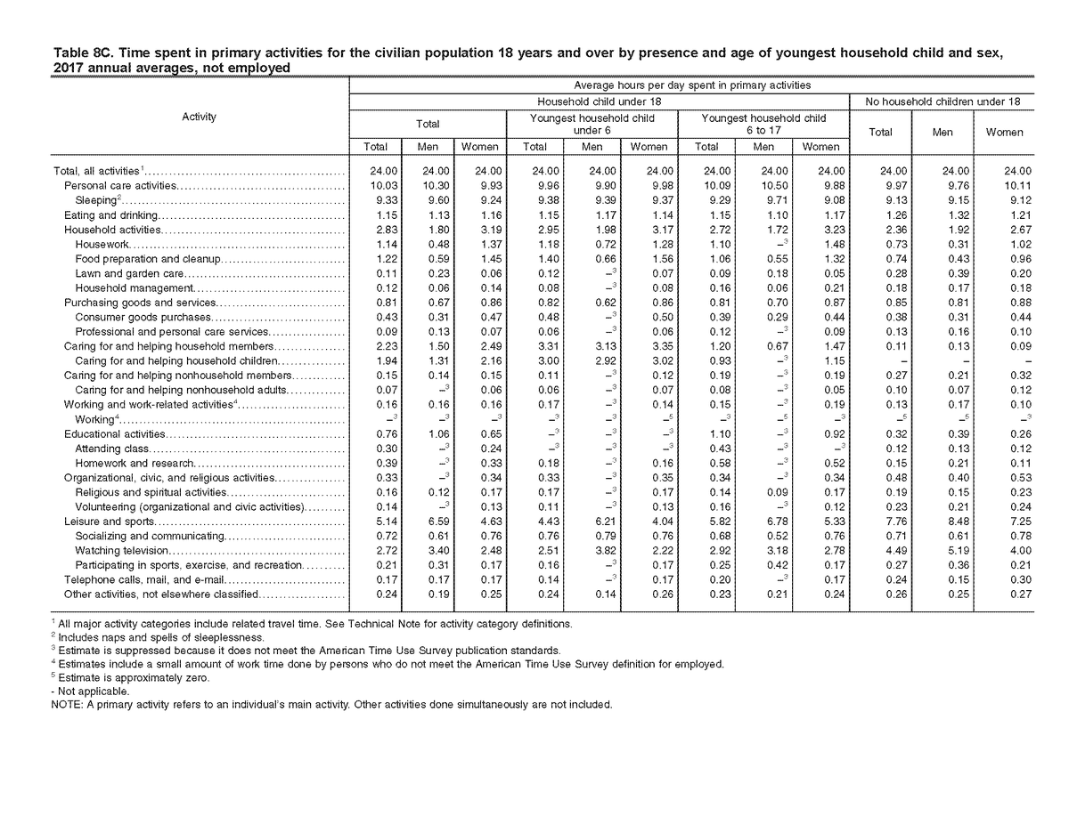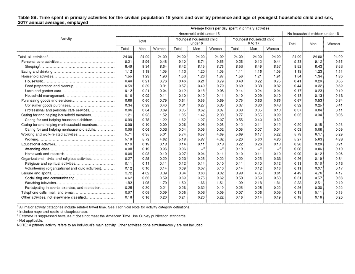 @stevieanntas @Caecavelry2 @Oneiorosgrip @StefanoZambell5 @Lilies09 @BLS_gov @pewresearch Similarly, comparing the men from Table 8B to the women from Table 8C (where the youngest child is under 6), women do household activities for 1.91 more hours per day than men in the most extreme case presented by Table 8A, but, again, men work 6.43 hours more per day than women.