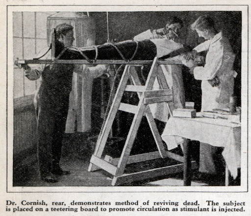 Sus métodos podrían parecer de broma, pues consistían en amarrar al difunto a una especie de balancín para hacer recorrer su sangre por su corriente sanguíneo y obligar al corazón a volver a bombear de nuevo.