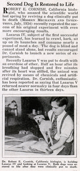 Pero en 1931, Cornish empezó a interesarse por un tema en concreto. Mas que interesarse, se podría decir que empezó a obsesionarse con la MUERTE, concretamente con devolver a la vida a los muertos.