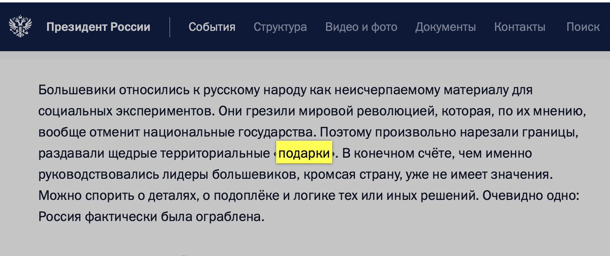 ...Putin published his amateur article "On historical unity of the Russians and the Ukrainians" (paying tribute to his hero Stalin, who published articles on philology), claiming Ukraine being a province of Russia, with its lands being "presented" by Russians on own costs. /3